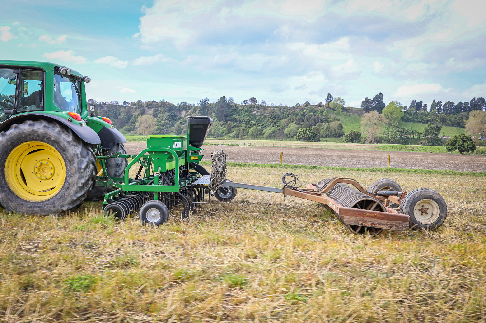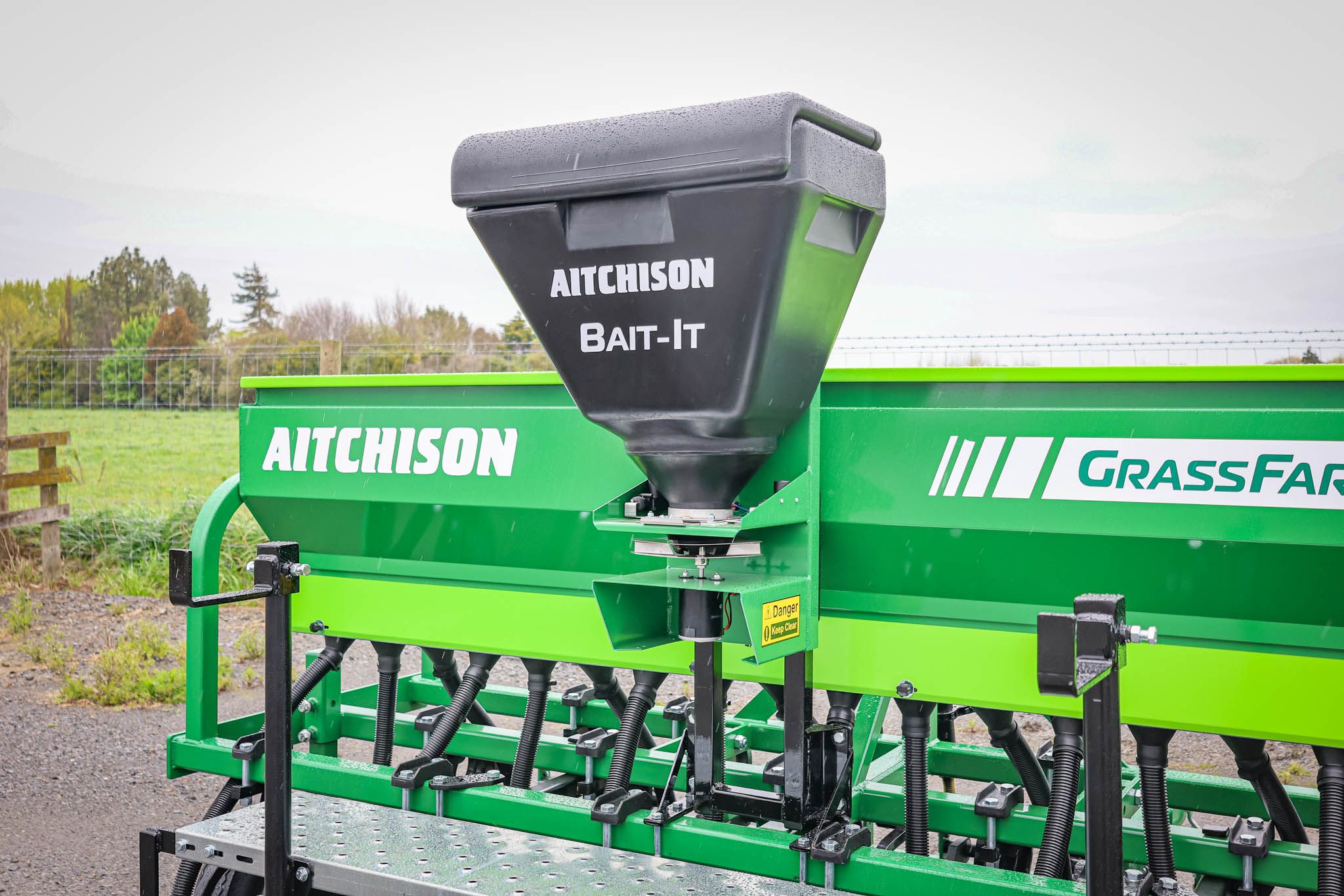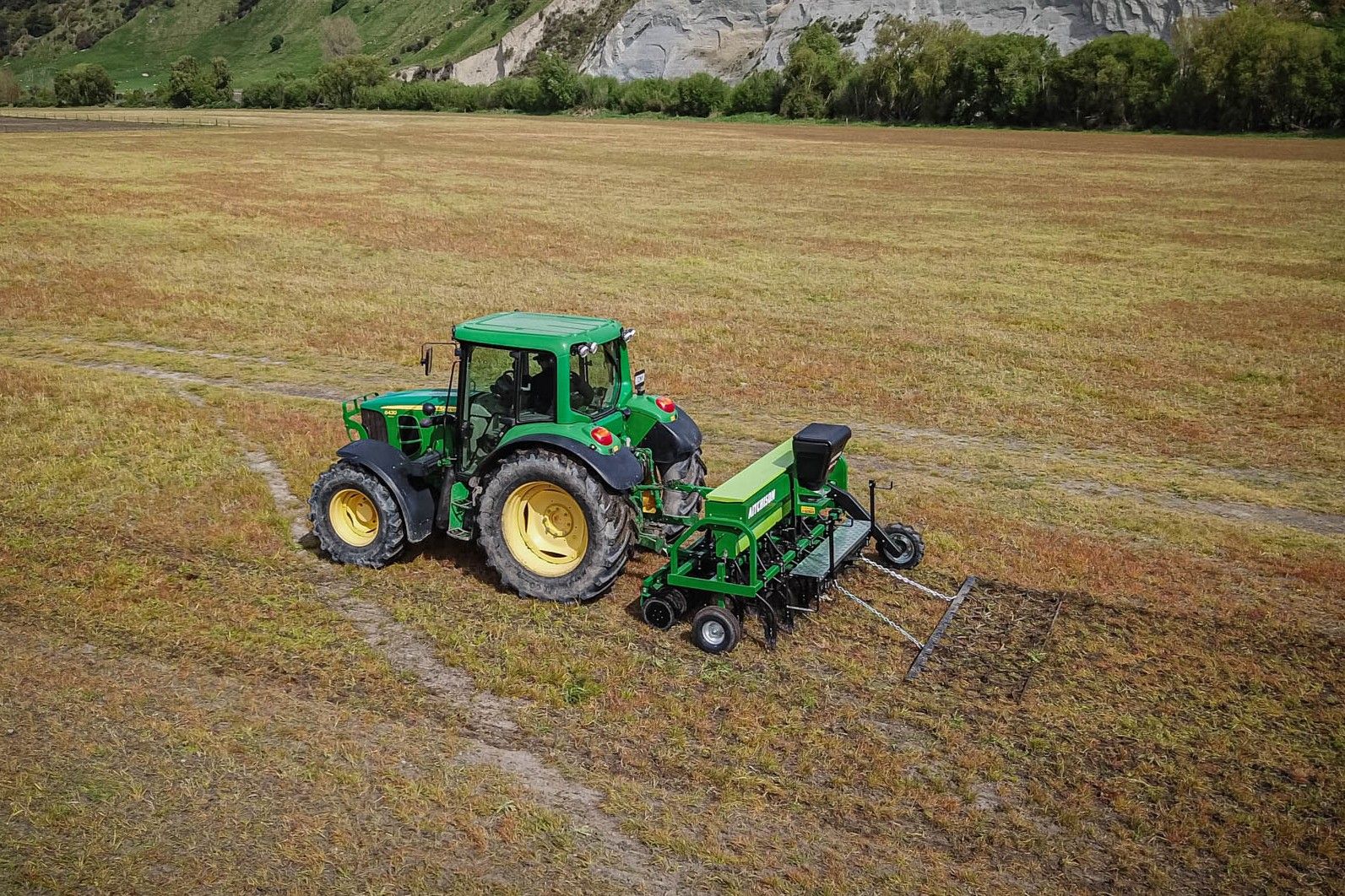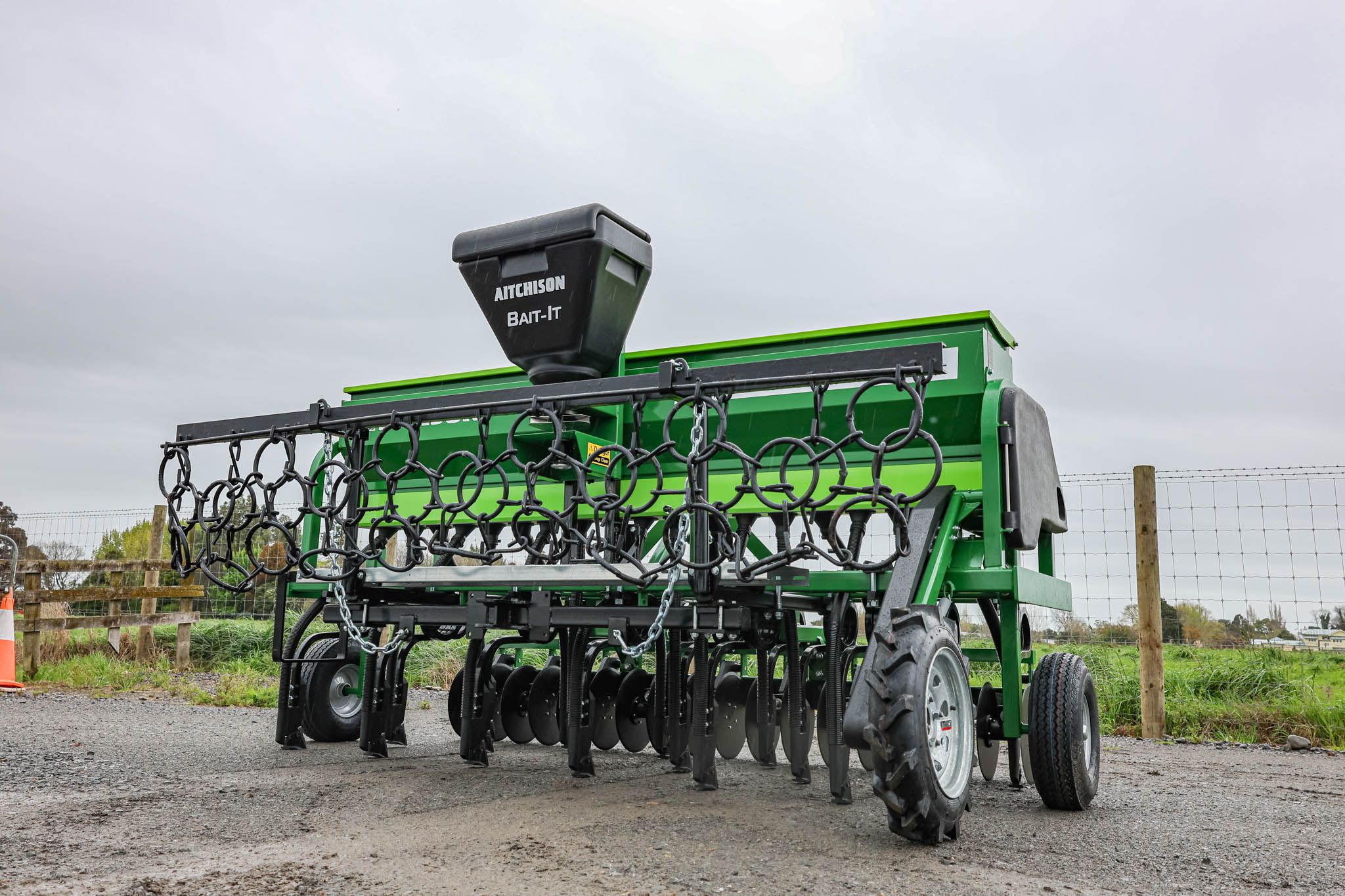 Shot near Mangaweka in New Zealand, this video shows the Aitchison GrassFarmer® 3018C tine seed drill paired with the Aitchison Bait-It slug bait applicator, treadboard, and HD harrows to maximise seed-to-soil contact.