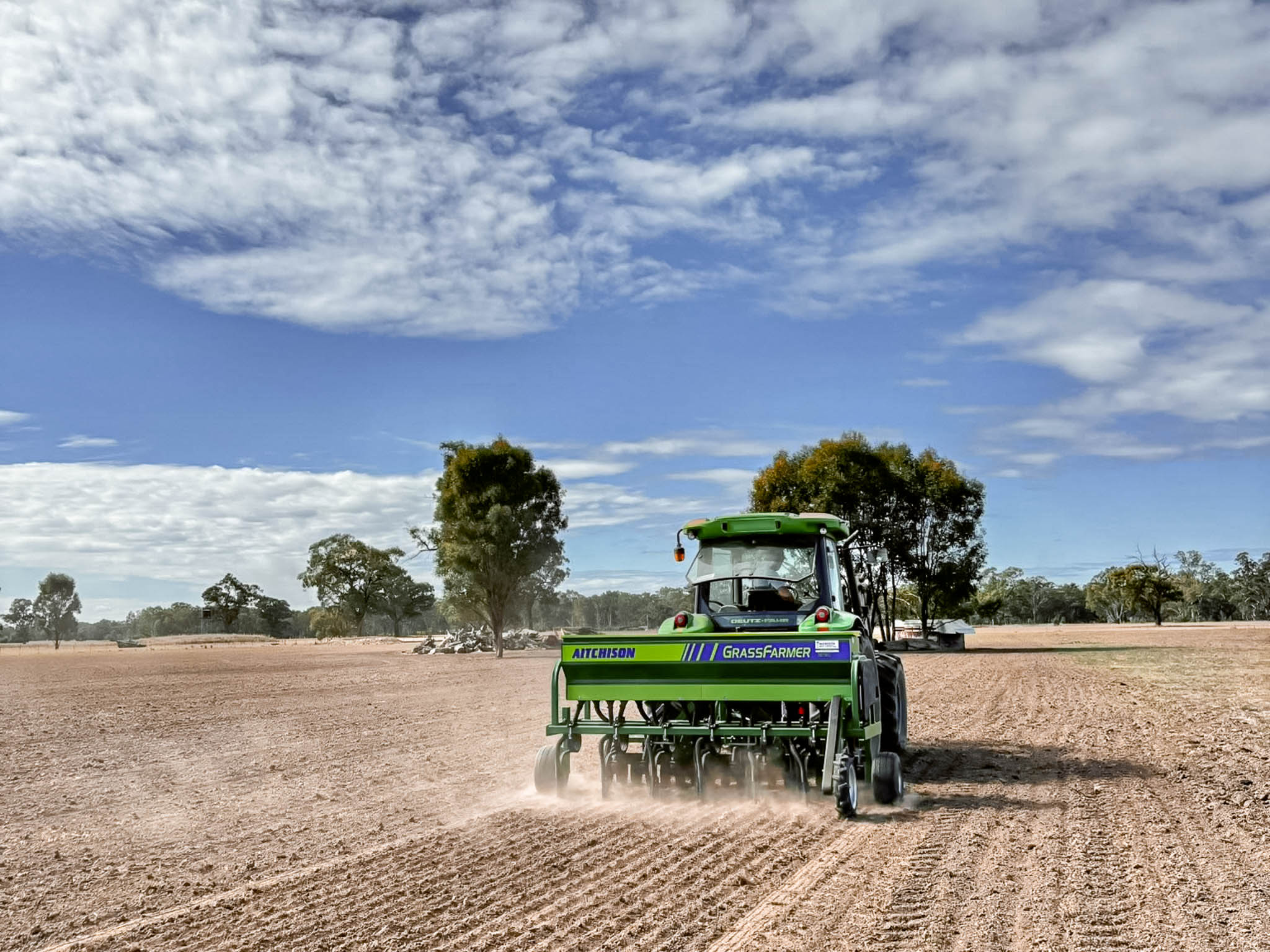 This video shows an original-livery Aitchison GrassFarmer® direct drilling in Queensland, Australia. To achieve the best possible results, the drill is working in tandem with a Cambridge roller, pressing the soil to maximize seed-to-soil contact and boost seedling survival in dry conditions.